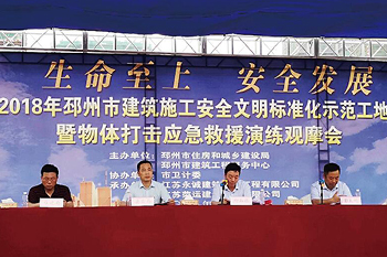 生命至上 安全發(fā)展 邳州市安全文明示范工地暨物體打擊應(yīng)急救援演練觀摩會(huì)在永誠(chéng)集團(tuán)承建的趙壩安置房項(xiàng)目工地召開