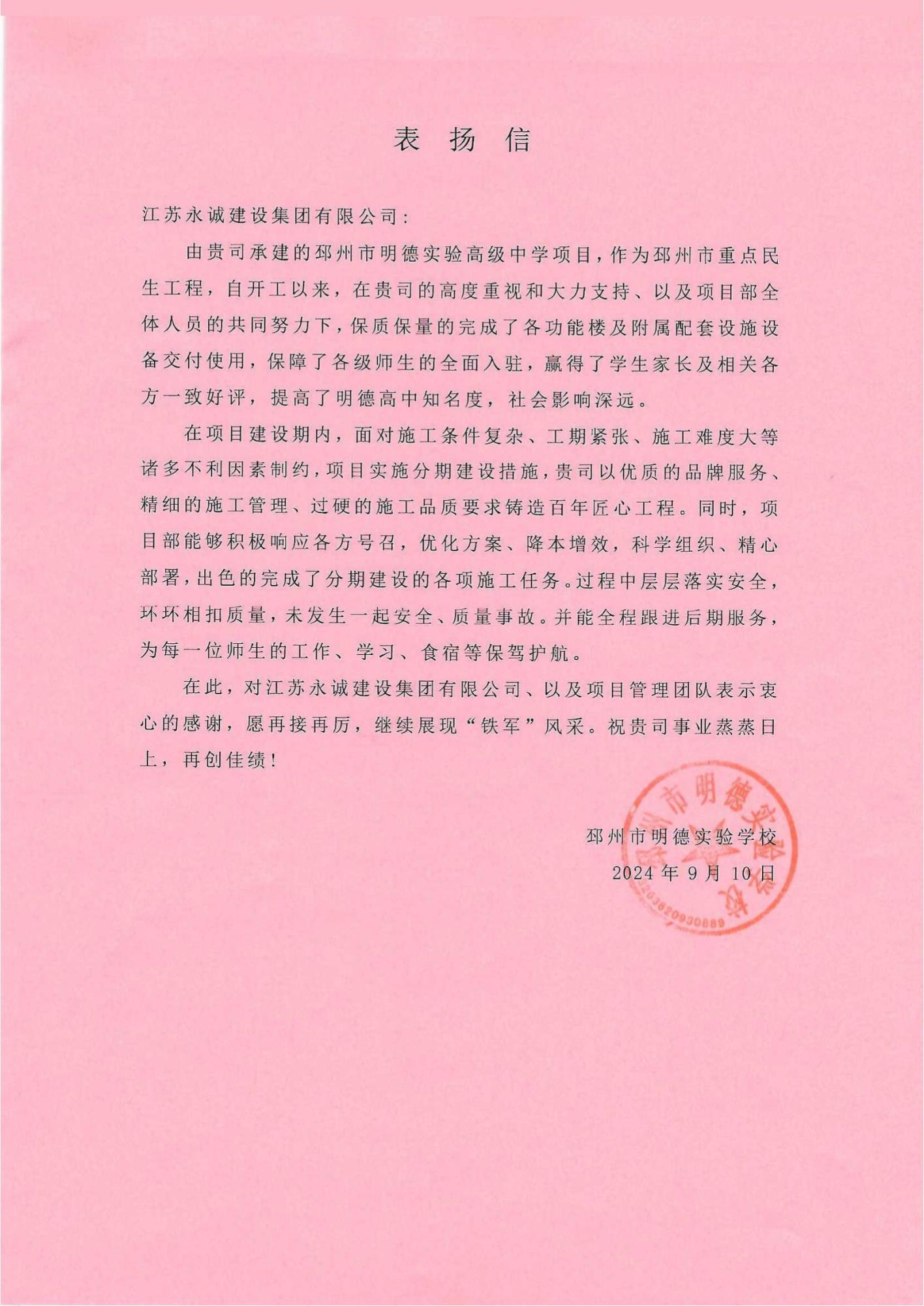 9月10日,伴隨著項(xiàng)目的圓滿結(jié)束,明德高中項(xiàng)目受到校方的高度評(píng)價(jià),并收到正式表揚(yáng)信。這不僅是對(duì)項(xiàng)目全體人員辛勤付出的認(rèn)可,也是對(duì)永誠集團(tuán)長(zhǎng)期以來堅(jiān)持高標(biāo)準(zhǔn)、高質(zhì)量工作態(tài)度的肯定。明德項(xiàng)目自啟動(dòng)以來,面對(duì)各…