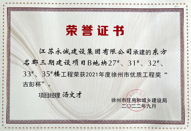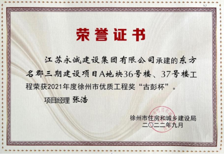 2022年9月,永誠建設(shè)承建的東方名郡三期項(xiàng)目A地塊36號(hào)、37號(hào)樓、B地塊27#28#29#30#31#32#33#35#樓工程榮獲徐州市優(yōu)質(zhì)工程獎(jiǎng)“古彭杯”。