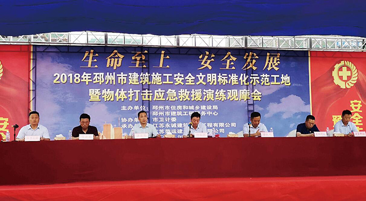 6月26日下午三點(diǎn),邳州市建筑施工安全文明標(biāo)準(zhǔn)化示范工地暨物體打擊應(yīng)急救援演練觀摩會(huì)在永誠(chéng)集團(tuán)承建趙壩安置房項(xiàng)目工地召開。邳州市委常委柳如鈺出席會(huì)議并講話;市政府辦、市房產(chǎn)中心、市安監(jiān)局、市住建局、市東湖街道辦等部門的負(fù)責(zé)同志,以及全市建筑施工企業(yè)分管安全負(fù)責(zé)人,在建工程施工單位項(xiàng)目負(fù)責(zé)人、專職安全員、項(xiàng)目總監(jiān)等近400人參加會(huì)議。